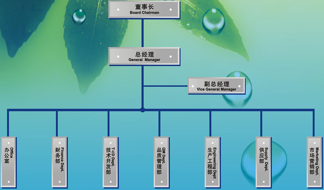 公司擁有嚴密、清晰的組織管理體系。由總經(jīng)理統(tǒng)籌負責,各部門分管不同的工作,即獨立、有效、快捷的完成每個生產(chǎn)環(huán)節(jié)、又形成相互合作、相互監(jiān)督的管理體系,為公司的持續(xù)發(fā)展奠定了堅實基礎(chǔ)。